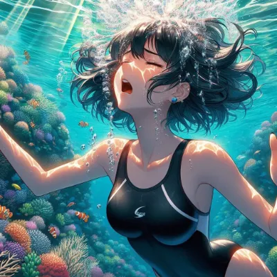 Detailed Anime illustration: A serene school pool with shimmering turquoise water. A girl with long, black hair tied up in a sleek ponytail swims gracefully. She is dressed in a simple neon yellow bikini with a floral pattern and is submerged, with bubbles and mesmerizing light refractions enhancing the scene. Best Quality.