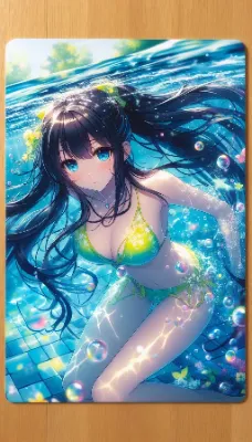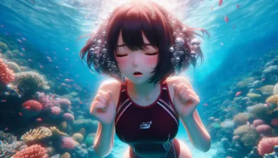 Detailed Anime illustration: A serene school pool with shimmering turquoise water. A girl with long, black hair tied up in a sleek ponytail swims gracefully. She is dressed in a simple neon pink bikini with a floral pattern and is submerged, with bubbles and mesmerizing light refractions enhancing the scene. Best Quality.
