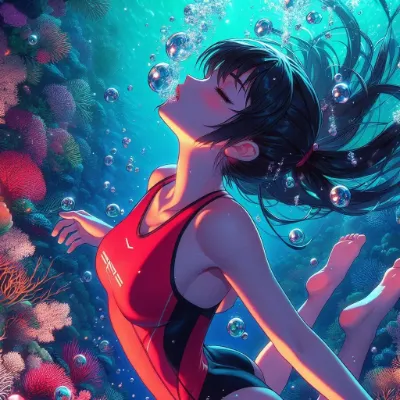 Detailed Anime illustration: A serene school pool with shimmering turquoise water. A girl with long, black hair tied up in a sleek ponytail swims gracefully. She is dressed in a simple skyblue bikini with a floral pattern and is submerged, with bubbles and mesmerizing light refractions enhancing the scene. Best Quality.