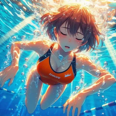 Detailed anime-style image of a girl of Asian descent unable to hold her breath while swimming at the bottom of the Coral Sea in night. She is wearing a sleek competitive sleeveless neon red swimsuit and has middle-short, flowing black hair with high ponytail. She appears to be exhaling or struggling underwater, with many air bubbles escaping from her mouth. She closes eyes. She is completely upside down. Best Quality.
