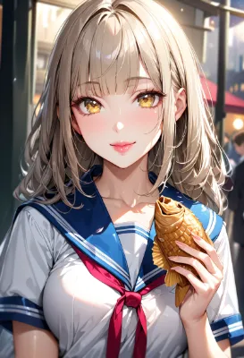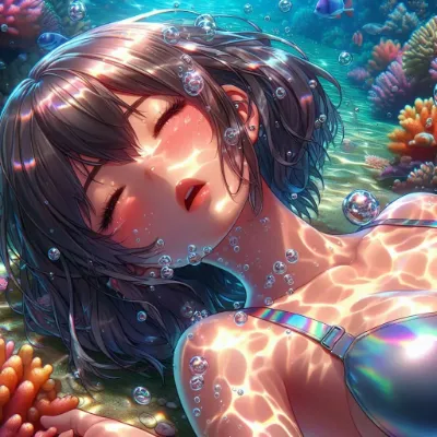 Detailed anime-style image of a girl descent on the bottom of a deep pool, struggling to hold her breath, with her eyes closed. She is wearing a sleek competitive sleeveless orange swimsuit, has short hair, and is sinking headfirst, completely upside down. Many air bubbles are escaping from her mouth, indicating she is exhaling. She is completely upside down. The underwater scene is vibrant, illuminated by light patterns from the sun. Best Quality.