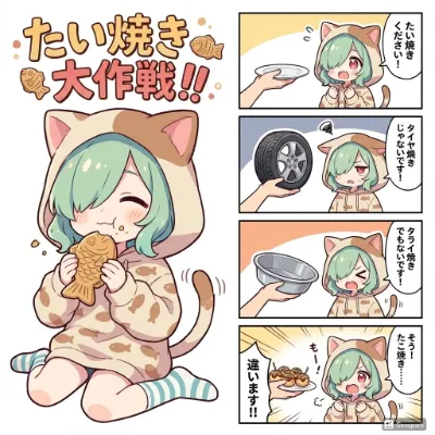 賑やかな商店街の路地を、猫耳の少女が軽やかに駆け抜ける。口にくわえた熱々のたい焼きが、今日の小さな戦利品。学校に遅れそう?それとも友達との秘密の待ち合わせ?彼女の尻尾が揺れるたび、街の喧騒が冒険の予感を運んでくる。日常の片隅で繰り広げられる、ほんのり甘い一幕。どんな物語が待っているのだろうか。 ※少年