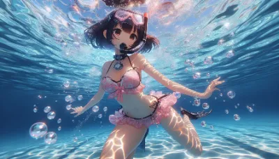 In a wide anime-style, depict an underwater scene showcasing a girl with short black hair, wearing a pink bikini with a floral pattern and hip frills and a diving mask, a snorkel, and fins, as she snorkels through a clear, expansive lake. Dynamic swirls of bubbles should be trailing behind her, while the light refractions from the water's surface cast a mosaic of dancing lights around her, highlighting the serene and tranquil underwater atmosphere.