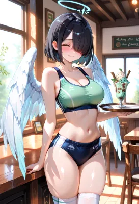 masterpiece, best quality, masterpiece, masterpiece, best quality, ultra detailed, woman blonde, angel halo, white big wings, headdress, bright smile, track and field wear, no sleeve, croped top, cleavage, midriff-baring, soft midriff, navel, high leg cut buruma, shiny thighs, thigh high socks, standing inside a mansion, A luxurious meeting room, cute magnets on a whiteboard, peaceful atmosphere, cinematic lighting