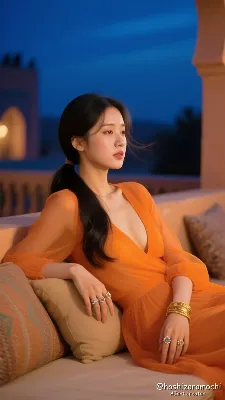 A Korean female, in her 20s. She is immersed up to her shoulders in the open-air bath, squinting her eyes and smiling gently. Her wet black hair is casually tied up, with loose strands sticking to the nape of her neck. She is completely naked and undressed. Her arms are resting naturally on the stone edge of the bath. Her face is turned slightly to the right of the front, and her gaze is slightly above the camera, gently flowing as if gazing at the distant scenery. Her cheeks and nose are flushed slightly by the heat of the hot spring, and tiny beads of sweat glisten on her forehead and neck. A range of deep green mountains lies in the background, with a large rock in the foreground. The composition is a mid-ground shot centered on the woman's upper body, shot from a slightly downward angle. White steam rises from the surface of the water, shining golden in the backlight. The soft orange light of dusk shines in from the side, beautifully illuminating the woman's profile and the steam. The shadows of trees flicker on the surface of the water, occasionally creating small ripples. The texture of the stone bathtub, the sheen of wet skin, the layer of steam rising.