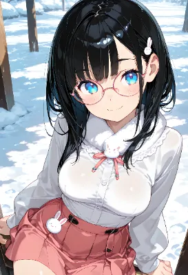 雪山で雪でうさぎの雪だるまを作る女の子を作ってみました。