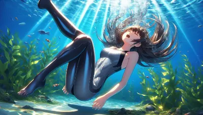 A detailed anime-style image of a girl unable to hold her breath while swimming at the bottom of the Coral Sea, viewed from below. She wears a sleek competitive vivid blue swimsuit and has flowing black hair in a high ponytail. She appears to be exhaling or struggling underwater, with air bubbles escaping from her mouth. The underwater scene is filled with vibrant light patterns from the sun and aquatic plants. Her hands are on her mouth. She closes eyes. Best Quality.