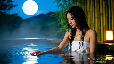 A Korean female, in her 20s. In the early morning hours of an open-air bath, a mysterious space shrouded in thick mist, she stands in the center of the bath. Clasping her hands behind her head, she is in the middle of wringing out her long, wet hair. Raising her arms reveals a white towel tightly tied around her chest. Her face is tilted straight up, her eyes closed, her mouth slightly open as she takes a deep breath. A beautiful line stretches from her neck to her collarbone, along which water droplets trickle down in streaks. The camera is positioned low, peering up from a low angle, capturing the woman's powerful figure. The background is shrouded in a dense mist, obscuring the silhouettes of distant trees and rocks. The diffused light filters through the mist, creating a soft, even illumination across the entire scene, but the area around the woman is submerged, almost as if in a spotlight. The surface of the bath is calm, and the woman is submerged from the waist down. The refraction of the water makes her feet appear distorted. Fog particles float in the air, scattering the light. The composition is symmetrical with the woman in the center, emphasizing vertical movement. The overall color tone is close to a monotone of white and gray, but the warmth of her skin remains slightly apparent.