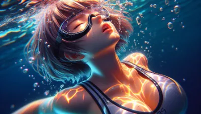 Detailed anime-style image of a girl of Asian descent unable to hold her breath while diving at the bottom of the Coral Sea. She is wearing a sleek competitive sleeveless dark red swimsuit and has long flowing hair with high ponytail. She appears to be exhaling or struggling underwater, with many bubbles escaping from her mouth. The underwater scene is filled with vibrant light patterns from the sun colorful fish. She closes eyes.She is completely upside down Best Quality