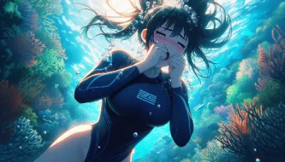 A close-up detailed anime-style image of a girl of Asian descent lying on the sea floor next to a coral reef. She appears unable to hold her breath, with her eyes closed and small bubbles escaping from her slightly parted lips. Her short hair, styled in a ponytail, floats around her. She wears a simple two-piece metallic rainbow swimsuit. The vibrant underwater environment includes colorful coral reefs and dappled light patterns reflecting off her skin. Best Quality.