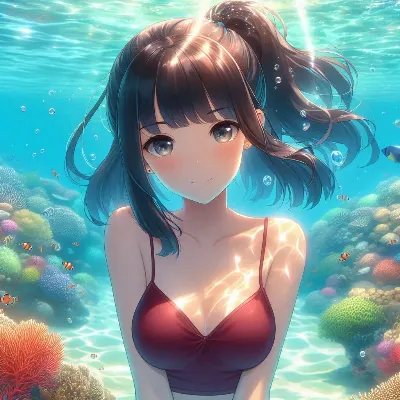 Detailed Anime illustration: A serene school pool with shimmering turquoise water. A girl with long, black hair tied up in a sleek ponytail swims gracefully. She is dressed in a simple metallic light orange bikini with a floral pattern and is submerged, with bubbles and mesmerizing light refractions enhancing the scene. Best Quality.