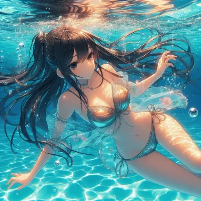 A close-up japanese very cute anime-style image of a girl of Asian descent lying on the sea floor next to a coral reef. She appears unable to hold her breath, with her eyes closed and small bubbles escaping from her slightly parted lips. Her long hair, styled in a ponytail, floats around her. She wears a simple two-piece rainbow swimsuit. The vibrant underwater environment includes colorful coral reefs and dappled light patterns reflecting off her skin. Best Quality.