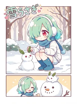 寒い冬の夜、緑色の髪の少女がふと立ち寄った屋台。赤い看板の下で、湯気の立つラーメンを頬張る。隣には卵や天ぷら、温かい料理が並び、雪が舞う中での一時の安らぎ。彼女の笑顔は、この幸運の味がもたらす小さな冒険の始まりを予感させる。街の灯りとランタンの光が、忘れられない瞬間を照らす。 ※少年