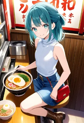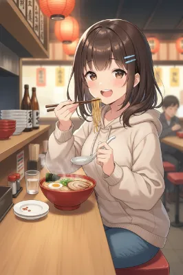 (girl eating ramen, slurping noodles naturally:1.2),