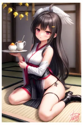 新年の朝焼けが空を染める中、紅白の着物をまとった巫女が、神聖な茶を捧げて立つ。彼女は古き神殿の守り手として、来るべき一年の幸運を祈る。長い黒髪が風に揺れ、花飾りが輝くその姿は、まるで神話から飛び出してきたよう。訪れる人々は彼女の優しい微笑みに、心の平穏を見出す。黄金の光が照らす階段で、冒険の始まりを予感させる瞬間。 「ふふ、今年も良いお茶を淹れましょうか。」とおっとり微笑みながらトレイを運ぶ黒髪の巫女少女。赤と白の華やかな着物に身を包み、穏やかな表情で新年の舞台に立つ姿が魅力的。