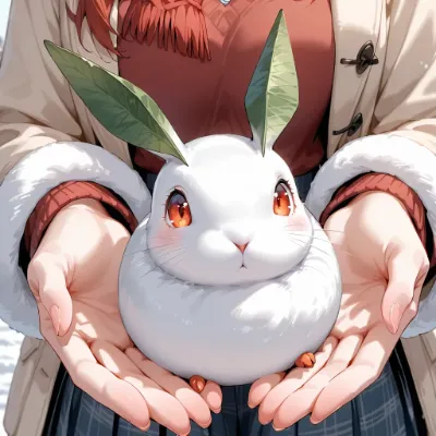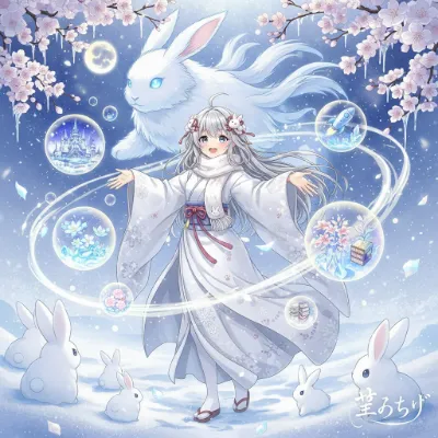 静かな雪の夜、ふわふわの白兎が雪原に座り、輝く瞳で空を見上げる。彼女は森の守護者として、降りしきる雪片に願いを込め、失われた星の友を探す冒険の始まりを予感させる。柔らかな毛並みが月光に照らされ、周囲の雪がきらめく中、どんな物語が紡がれるのか。白兎の小さな足跡が、幻想的な冬の旅を誘う。
