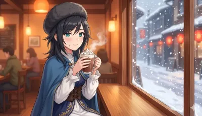 character with black medium hair with light natural outward flick at ends, teal-green eyes, mole on left cheek, calm serious expression with subtle confident resolve, eyes fixed on snow rabbit,