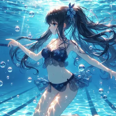 A detailed anime-style close-up image of a girl of Asian descent underwater. The image captures her upper torso and face depicting her struggling to hold her breath. Her short hair moves around her in the water. She is exhaling with many bubbles escaping from her mouth. She wears a sleek competitive silver swimsuit. The lighting reflects the underwater environment with vibrant dappled light patterns reflecting off her skin. She closes eyes. She is completely upside down.