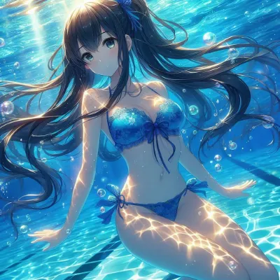 Detailed Anime illustration: A serene school pool with shimmering turquoise water. A girl with long, black hair tied up in a sleek ponytail swims gracefully. She is dressed in a simple navy blue bikini with a floral pattern and is submerged, with bubbles and mesmerizing light refractions enhancing the scene. Best Quality.