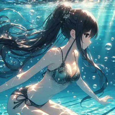 Detailed Anime illustration: A serene school pool with shimmering turquoise water. A girl with long, black hair tied up in a sleek ponytail swims gracefully. She is dressed in a simple navy blue bikini with a floral pattern and is submerged, with bubbles and mesmerizing light refractions enhancing the scene. Best Quality.
