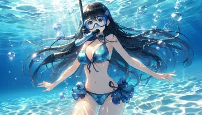 Anime-style image of a girl descent unable to hold her breath while lying on her back inside the deep rocky underwater cave. She is wearing a sleek competitive sleeveless dark red swimsuit and has flowing middle-short hair. She appears to be exhaling or strugglng underwater, with many air bubbles escaping from her mouth. The underwater scene is eerie. She closes eyes. She is completely upside down. Best Quality.