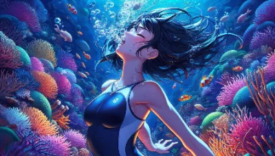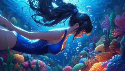 Ultra detailed anime-style image of a girl of Asian descent unable to hold her breath while swimming at the bottom of the Coral Sea in night. She is wearing a sleek competitive sleeveless deep blue swimsuit and has short, flowing black hair with high ponytail. She appears to be exhaling or struggling hardly underwater, with many air bubbles escaping from her mouth. She closes eyes. She is completely upside down. Best Quality.