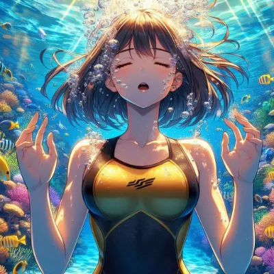 Detailed anime-style image of a girl of Asian descent unable to hold her breath while swimming at the bottom of the Coral Sea in night. She is wearing a sleek competitive sleeveless dark blue swimsuit and has middle-short, flowing black hair with high ponytail. She appears to be exhaling or struggling underwater, with many air bubbles escaping from her mouth. She closes eyes. She is completely upside down. Best Quality.