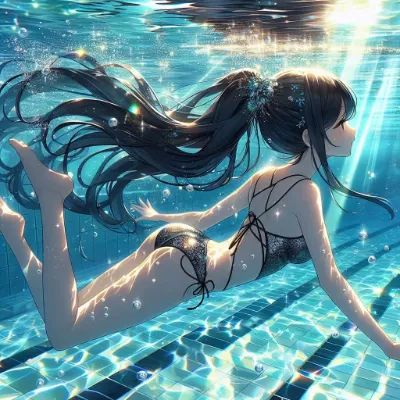 Detailed Anime illustration: A serene school pool with shimmering turquoise water. A girl with long, black hair tied up in a sleek ponytail swims gracefully. She is dressed in a simple neon light pink bikini with a floral pattern and is submerged, with bubbles and mesmerizing light refractions enhancing the scene. Best Quality.