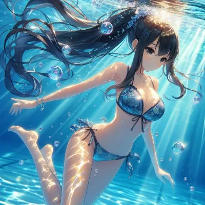 Detailed Anime illustration: A serene school pool with shimmering turquoise water. A girl with long, black hair tied up in a sleek ponytail swims gracefully. She is dressed in a simple metallic blue bikini with a floral pattern and is submerged, with air bubbles and mesmerizing light refractions enhancing the scene. Best Quality.