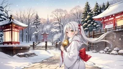 (masterpiece:1.2), best quality, ultra detailed, high resolution, 1girl, long flowing silver twin-tails with subtle gold ribbon fluttering in wind:1.3, emerald eyes looking at viewer with gentle loving smile and soft blush from cold air, wearing cozy oversized warm light gray hoodie trainer (fleece lining visible, modestly covering body) under winter coat, medium-large breasts naturally prominent but fully covered, standing outdoors in snowy street or park path, gentle snow falling around her, warm scarf and gloves, city lights or street lamps in background, heartwarming winter outdoor date atmosphere, anime style, glossy finish, dreamy cool blue with warm orange accents, <lora:add_detail:0.7>
