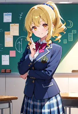 masterpiece, best quality, extremely detailed, anime style, cute gothic atmosphere, young girl with wavy blonde hair and bright blue eyes, slightly childish and adorable expression, holding a wax seal stamp over a letter, blue sealing wax with a rose emblem, soft candlelight, gothic interior with gentle decorations, pastel accents mixed with dark tones, secretive smile, warm and charming mood