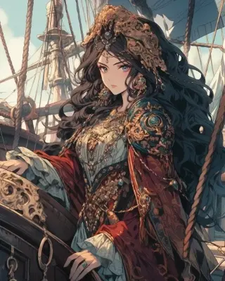 In a port town at night lined with white buildings, a female pirate drinks in the night breeze while gazing at the moonlit sea. She has a beautiful face and shining eyes of vivid colors. She wears elaborate and delicate ornaments. The port town, lined with buildings with white walls, shines faintly in the moonlight. Detailed drawings. Vivid colors. High image quality. --s 1000 --ar 4:5 --niji 5