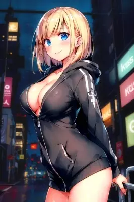 1girl, kawaii, cute face, big eyes, blonde hair, short hair, swept bangs, blue eyes, round eyes, light smile, closed mouth, large breasts