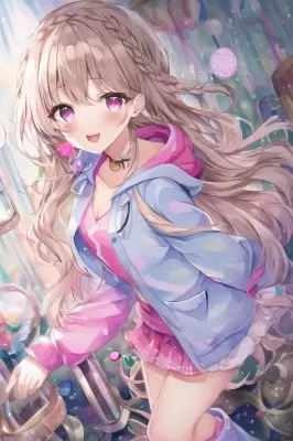 masterpiece, best quality, {{full body}}, {{watercolor}}, {{solo, one cute girl}}, ({{light pink}} and {{{multicolored light brown hair}}}, disheveled hair, {{long wavy hair}}, {{crown braid}}, {{baby face, long eyelashes}}, {{is wearing modern personal clothing}}, [casual], {{{Harajuku fashion}}}, medium breasts, {{beautiful detailed eyes, pink eyes}}), {{master peace}}, {make the eyes the same shape and color on both sides}, {{8k wallpaper}},