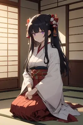 masterpiece, best quality, ultra-detailed, high resolution, extremely detailed CG, textile shading, perfect anatomy, beautiful detailed eyes, a pretty woman, 1girl, shrine maiden, night, moon, beautiful black hair, beautiful purple eyes, long hair, face focus, resting under his chin,
