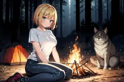 1girl, cute face, kawaii, short blonde hair, straight hair, swept bangs, blue eyes, closed mouth, light smile, large breast, t-shirt, denim pants, sitting, tent,