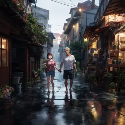 masterpiece, best quality, high resolution, ultra-detailed, nsfw, 2person, daddy and daughter, Two sandal-wearing men walk soaking wet in a squall rain through a street lined with flowers. BREAK