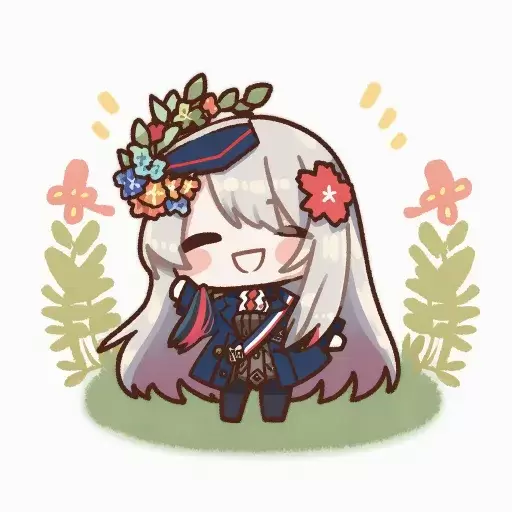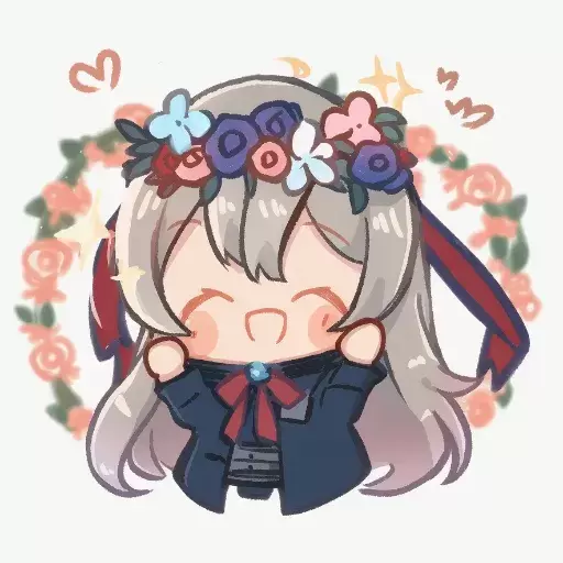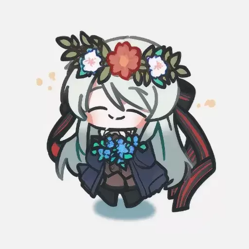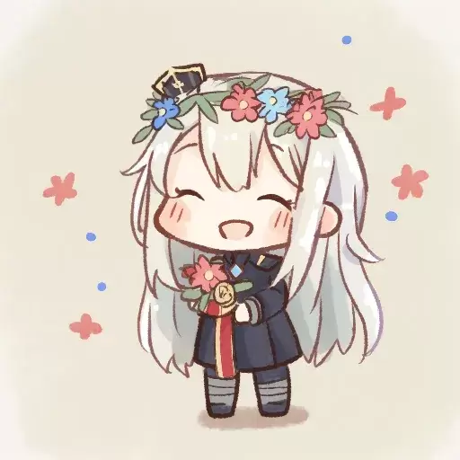 lofi chibi muted colors watercolor tone cool slender kawaii anime girl with long silver hair blue eyes wear laurel-wreath and black long coat with red and blue accents,ribbons,smile