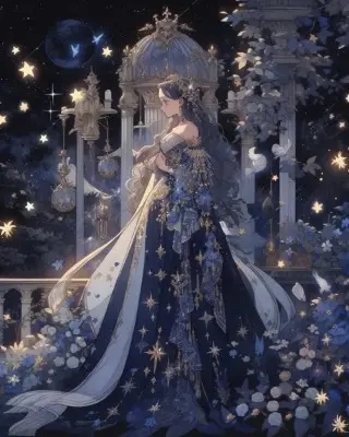 湖の浅瀬に足をつけ、星座が浮かび上がる夜空を見上げる、ドレスを身に着けた美しい女性。美しい顔立ちに、鮮やかな色彩の輝く瞳。緻密かつ繊細な装飾品を身に着けている。空にいくつかの星座がシルエットとなって浮かぶ幻想的な夜。詳細な描き込み。鮮やかな色彩。高画質。