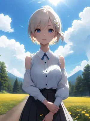 (kawaii background:1.3), (extremely detailed fine touch:1.3), (hard light, studio light, light rays, dappled light, reflection, shadows, ray tracing:1.0), ///, kawaii girl, black short hair, school girl, black tights, (upper body:1.3), (Wide meadow hills, horizon, blue sky, white clouds, long road to nowhere, beautiful scenery, nature, flowers, trees:1.3), (zentangle:1.3)