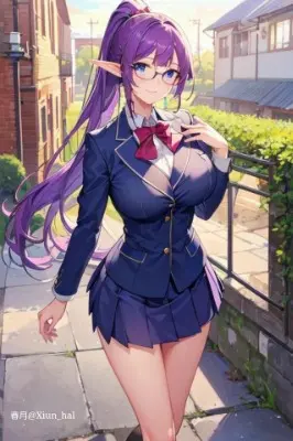 masterpiece, best quality, ultra-detailed, kawaii, cute, lovely, anime style, upper body, city, town, sweets, (cream puff), eat, a pretty woman, elf, solo, school uniform, beautiful purple hair, beautiful blue eyes, beautiful eyes, long hair, large breast, glasses, light smile