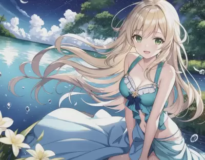 (extremely detailed CG unity 8k wallpaper:1.0),(masterpiece:1.0),(best quality:1.0),(ultra-detailed:1.0),(best illustration:1.0),(best shadow:1.0),(an extremely delicate and beautiful:1.0),(finely detail:1.0),(classic:1.0),(painting:1.0),(floating:1.0),(bloom:1.0),(shine:1.0),(sketch:1.0),(cute face:1.0),(anime face:1.0),(solo:1.0),(beautiful detailed face:1.0),(shiny hair:1.0),(beautiful 5 finger beautiful kkkza:1.0),(18 years old:1.0),(green eyes:1.0),(long hair:1.0),(wavy hair:1.0),(blonde hair:1.1) and (white hair:1.1),(flower hair ornaments:1.0),(seductive smile:1.0),(open mouth:1.0),(sarong:1.0) with (cape:1.0),(best illumination:1.0),(best shadow:1.0),(an extremely delicate and beautiful:1.1),(only water:1.2),(Clear and turquoise sky:1.0),(Water as smooth as a mirror:1.0),(petal:1.0),(There are clouds where water and sky connect:1.0),(Colorful clouds:1.1),(depth of field:1.0),(beautiful detailed sky:1.0),(Cyan sky:1.0),(beautiful detailed cloud:1.0),(beautiful detailed water:1.0),(reflection pool:1.0),(floating:1.0),(bloom:1.1),(shine:1.1),(glinting stars:1.0),(feather:1.0),(nature:1.0),(sunlight:1.1),(fairyland:1.0),