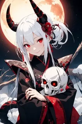 a japanese demon girl with horn, quiet gaze and evil smile, hugging a skull, black kimono, white hair, red eyes, looking afar, cold expression, starry sky