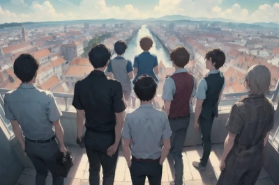 Superlative, super quality, group of 7 high school girls, spectacular view