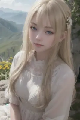 Loving viewer very much,great view from the top of the mountain,climber style,turn around,look at viewer,smiling shyly,blush,sun in the sky,majestic mountains in the background,blonde beauty,20 years old,full body,beautiful face,(symmetrical clear eyes:1.3),gold eyes,flower-shaped pupils,long eyelashes,double eyelids,detailed long hair,bangs,detailed fingers,realistic face,realistic body,small-chest,(RAW photo,best quality),(realistic,photo-realistic:1.3),masterpiece,super high resolution,extremely delicate and beautiful,Amazing,finely detail,extremely detailed CG unity 8k wallpaper,absurdres,depth of field,far from viewer,cinematic angle,beautiful detailed background