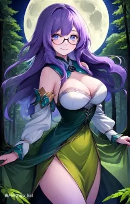masterpiece, best quality, ultra-detailed, extremely detailed, 4K, 8K, best quality, beautiful, illustration, fish-eye lens, dynamic angle, look down from above, focus on background, cloudy, cloud, shiny, sacred place, mountain, forest, beautiful sky, sunrise, a pretty woman, solo, elf, spirit, beautiful purple hair, beautiful blue eyes, beautiful eyes, long hair, large breast, glasses, light smile