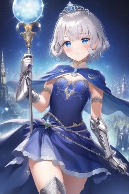 masterpiece, best quality, from distance, life after people , the little sturdy magical girl , crying , brave and lovable, clear silver inward curl short hairs , a miracle staff in hand , short sleeve beautiful indigo dress with embroidery, fair skin, cute detailed eyes , opera groves , elegant long greaves , armlets, miracle jewel, short cloak , princess tiara ,full body , elaborately painted, {{{best quality }}}, {{{best detailed}}}