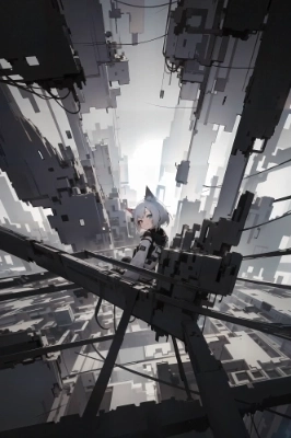 cute iilustration, one girl with cyan long hair and fox ear, vampire, collapsed castle,beautiful moon, dark,darkness, looking at viewer, bat, laugh, full body, sitting, dark forest, <lora:flatBG:-0.5> <lora:flat2:0.1>