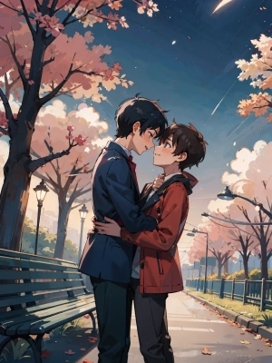 male focus, highres, yaoi, gay, portrait, from side, outdoors, night, night sky, park, park bench, lamppost, bush, tree, flower,