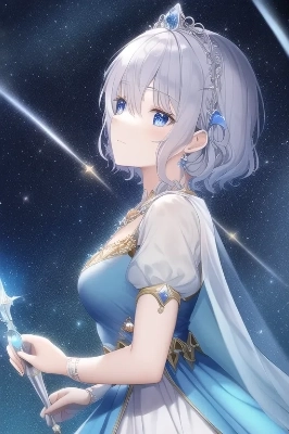 masterpiece, best quality, she look out over whole metropolis from the roof of the building , the little sturdy magical girl , clear silver inward curl short hairs , a miracle staff in hand , short sleeve beautiful indigo dress with embroidery, short skirt , fair skin, cute detailed eyes , opera groves , cool , cute , pretty, kawaii, child , cinematic light , amazing, full body , elegant long greaves , armlets, miracle jewel, short cloak , princess tiara, elaborately painted, {{{best quality }}}, {{{best detailed}}} , {{masterpiece}}
